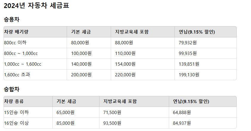 자동차세는 차량 소유자가 연도별로 정부에 지불해야 하는 세금으로, 차량의 종류와 배기량에 따라 책정됩니다.