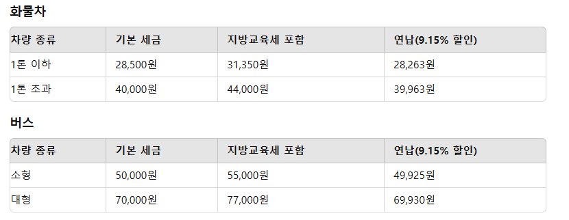 차종별 세금 구분: 승용차, 승합차, 화물차, 버스 등 각각의 차종에 따라 세금 산정 방식이 다를 수 있습니다.